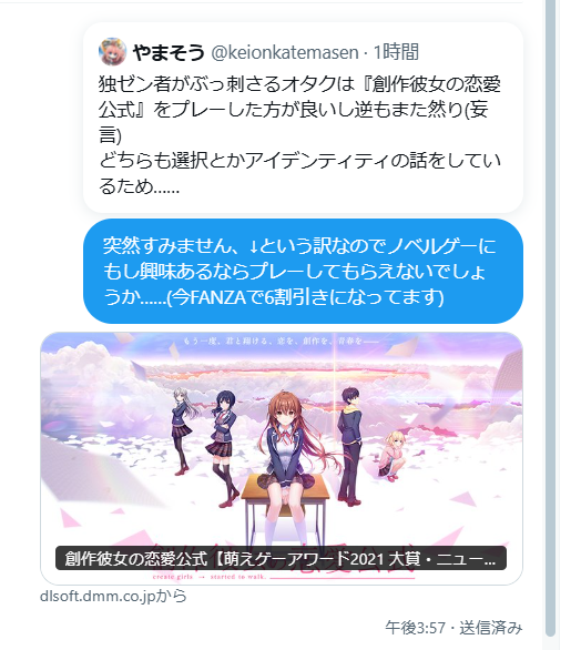 今回のライブをおすすめしてくれたフォロワーを脅してエロゲをプレーさせようとしてるらしい。いやマジでテーマ性が近しい所があって面白いんでこの記事読んだせんせえの方いれば頼みます……
